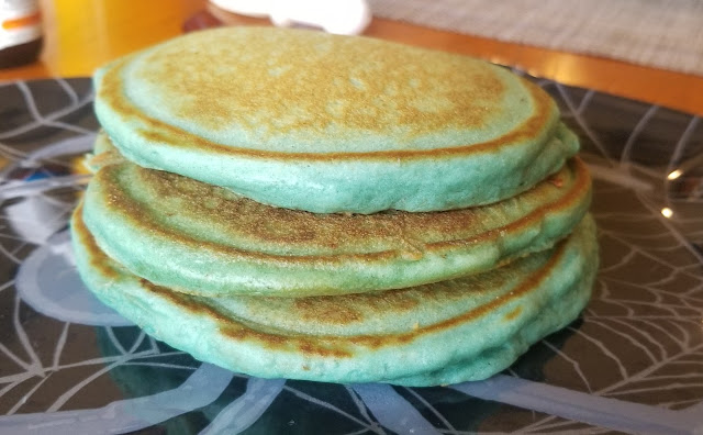 It was a very busy Saturday: we had an Easter egg hunt to attend, needed to reorganize the freezer to make room for the 1/4 cow coming our way, attend my aunt's 80th birthday party...oh yeah, and FEED THE BEAST that is Mandough.Again, we turn to The Clever Carrot for a nice, easy recipe. I made the "Same Day" option. I made a few for The Hubs first (plain, but with lots of butter in the pan so the edges get crispy), then wiped out the pan a bit and made the chocolate chip ones for me...then added some blue food coloring to the last of the batter for the kiddo. AND those got chocolate chips as well. Because chocolate chip pancakes are THE BEST.